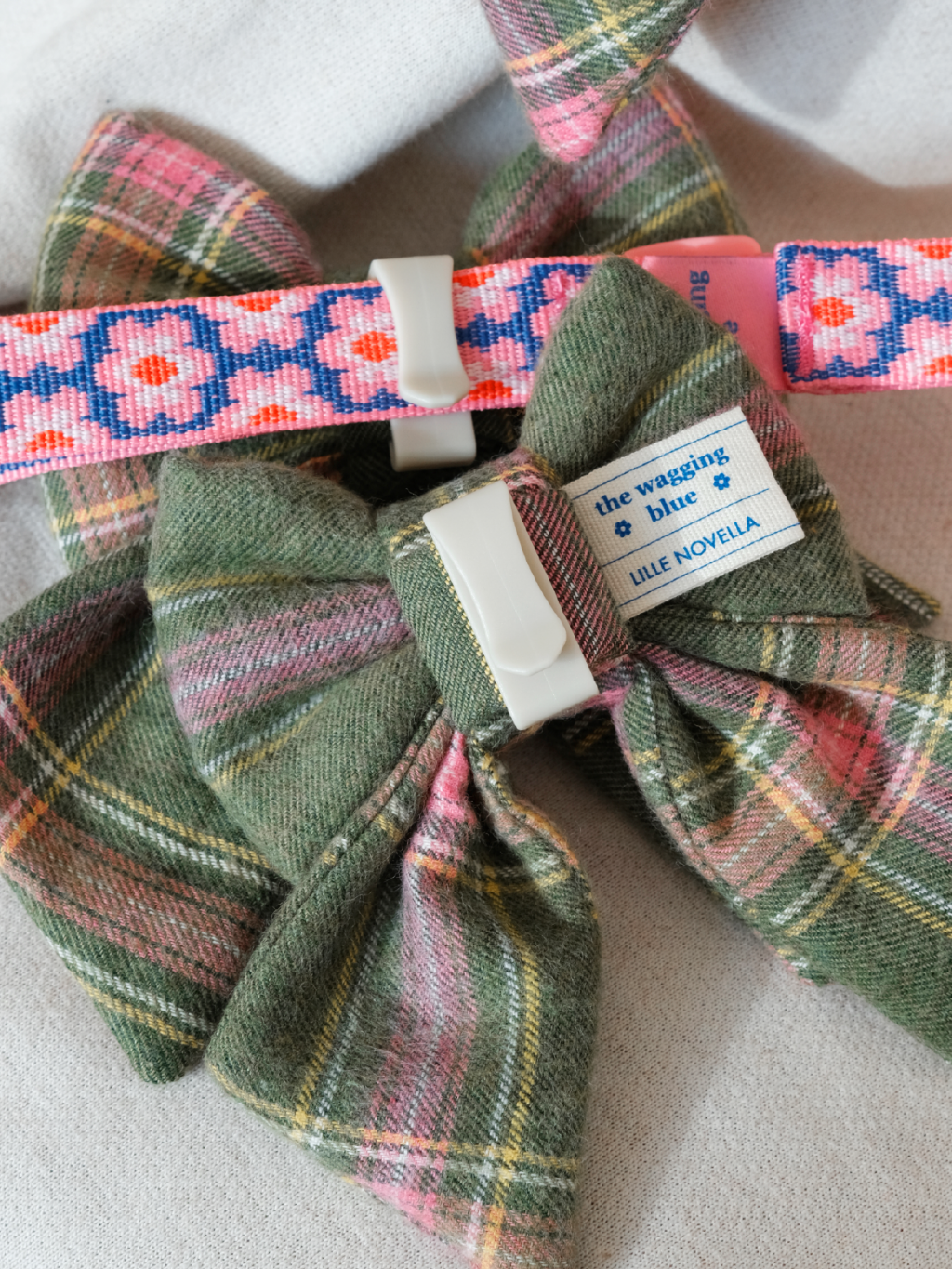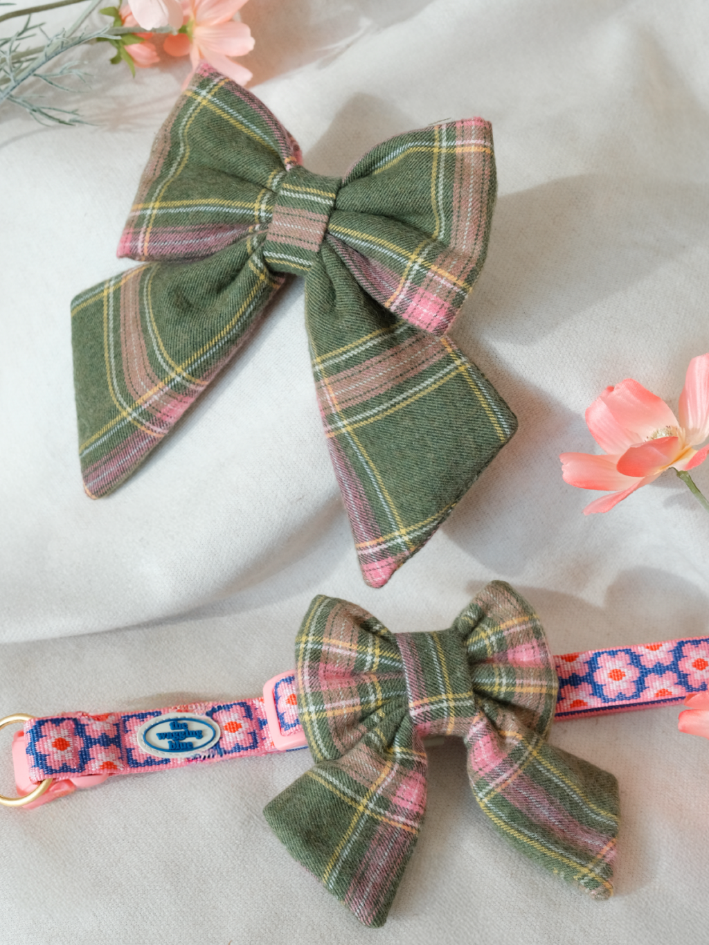 A neat navy plaid bow that adds a clean, smart look.